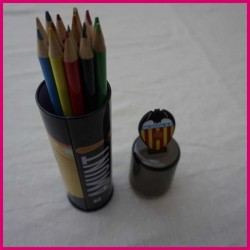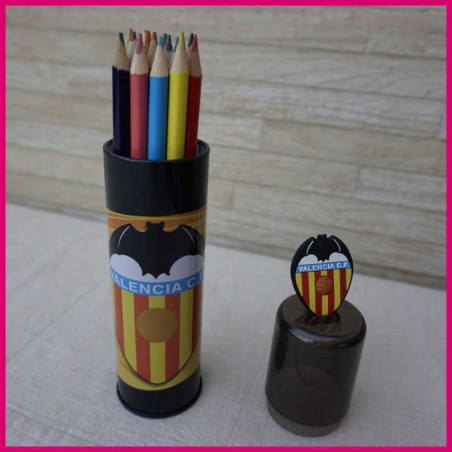 Portalápices del Valencia C.F. con lápices de colores.